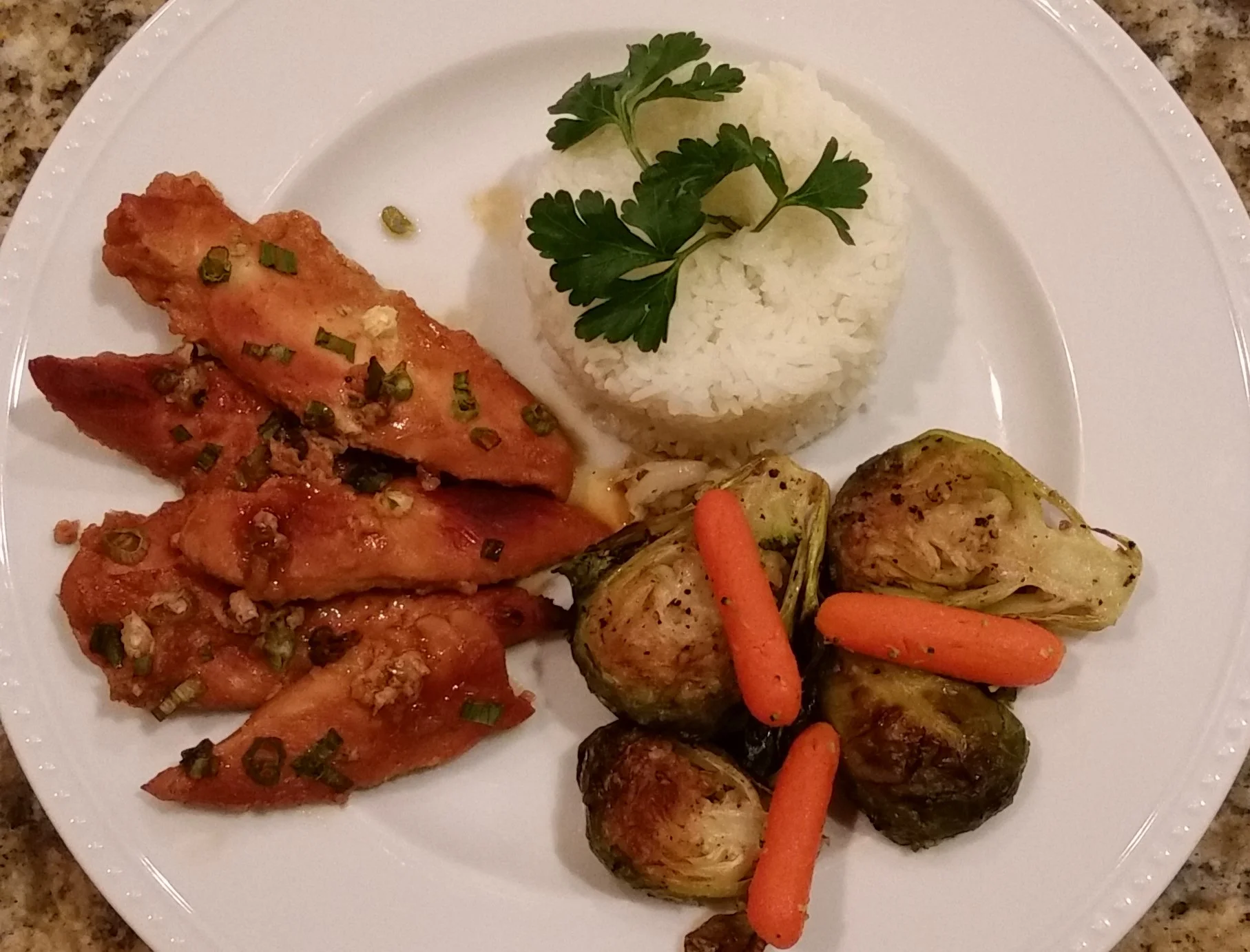I served it with white jasmine rice and garlic roasted Brussels sprouts. (Halve the brussels sprouts, place in baking dish, sprinkle with oilve oil, add 2-3 cloves of minced garlic, season with salt and pepper, roast it in oven on 400 to 425 degrees). Delicious! Enjoy! #mommyknowsbest
